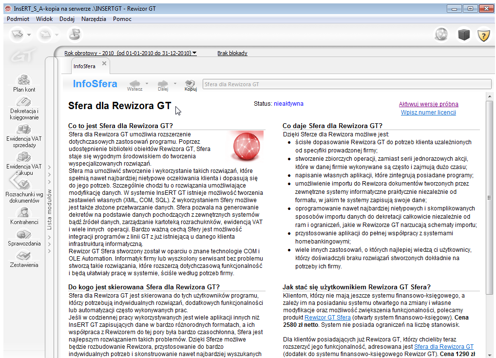 Rewizor GT Sfera to nowoczesny system finansowo-księgowy dla małych i średnich przedsiębiorstw. Jest to rozszerzona wersja Rewizora GT, wzbogacona o mechanizm umożliwiający dowolną rozbudowę programu.