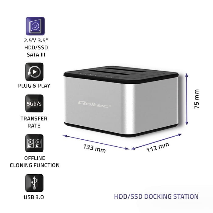Stacja dokująca Qoltec 2xHDD/SSD 2.5/3.5 SATA USB 3.0 (klonowanie)
